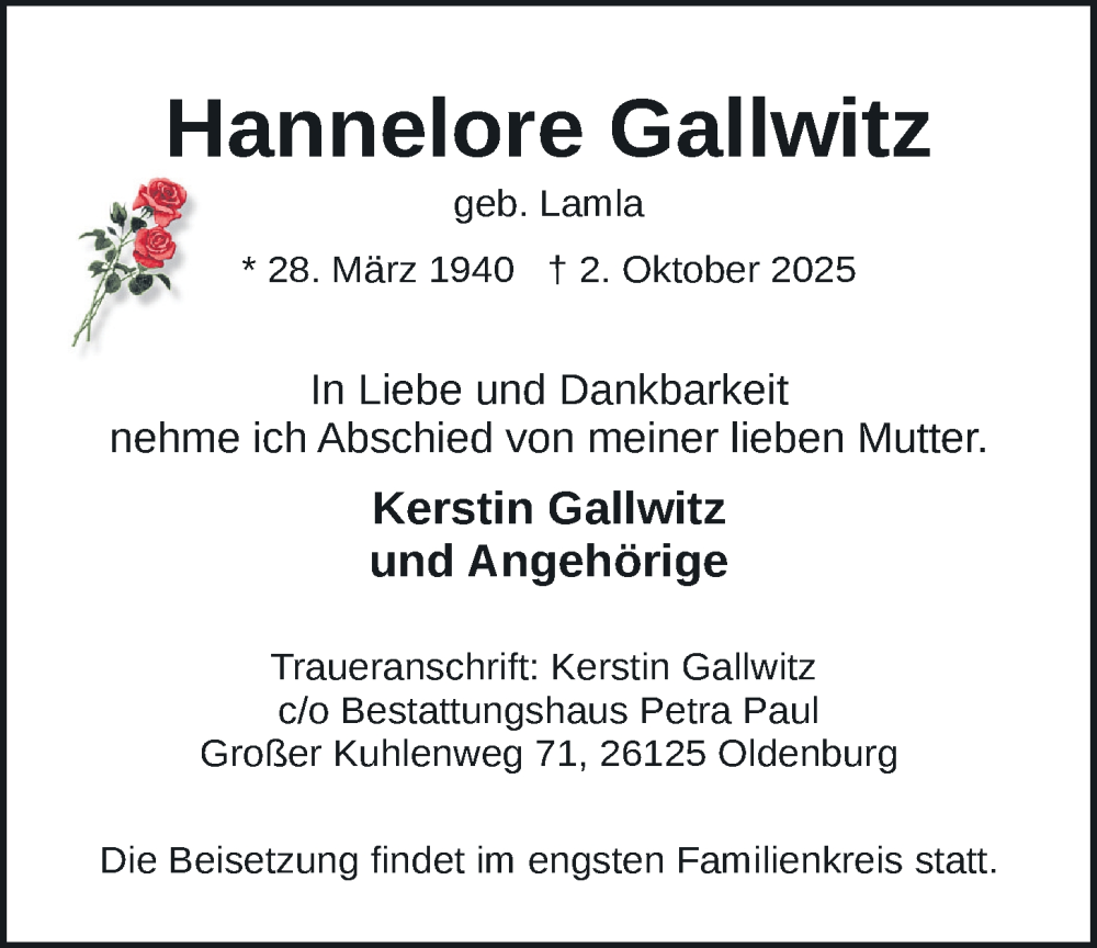 Hier finden Sie alle Traueranzeigen aus der Zeitung, die bisher für Hannelore Gallwitz erschienen sind. Weitere Traueranzeigen, die in der Zeitung erscheinen, werden hier ebenfalls aufgelistet
