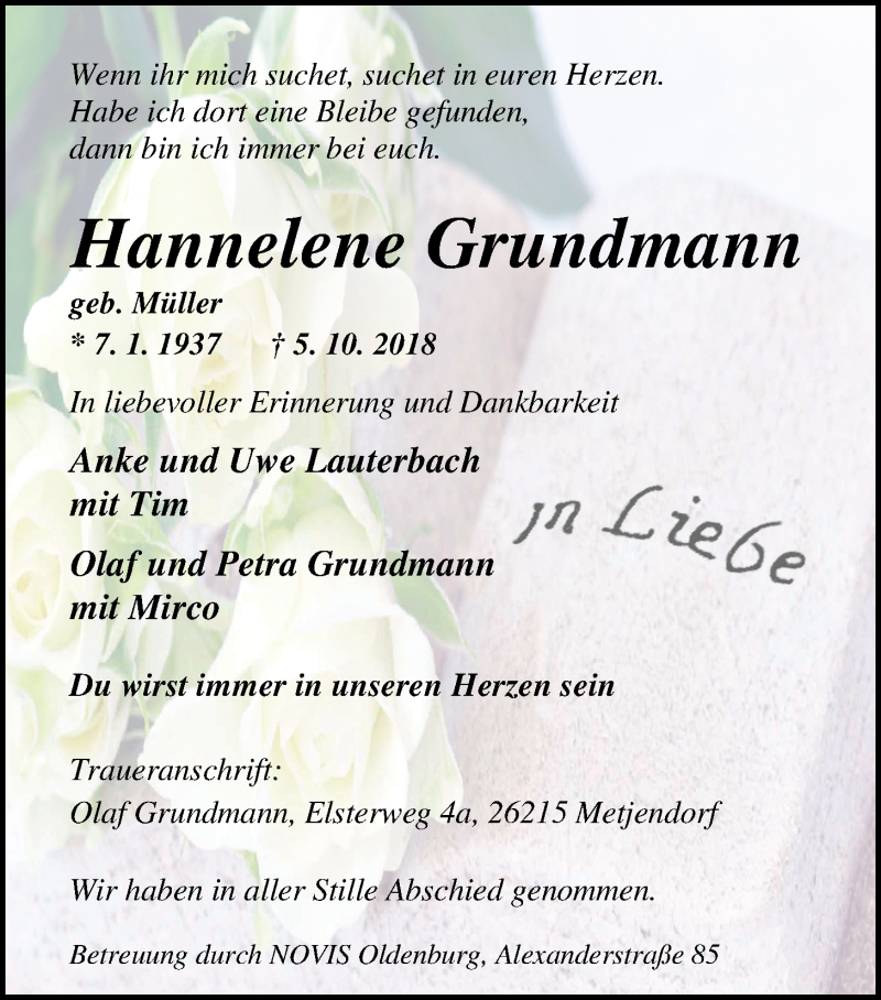Hier finden Sie alle Traueranzeigen aus der Zeitung, die bisher für Hannelene Grundmann erschienen sind. Weitere Traueranzeigen, die in der Zeitung erscheinen, werden hier ebenfalls aufgelistet