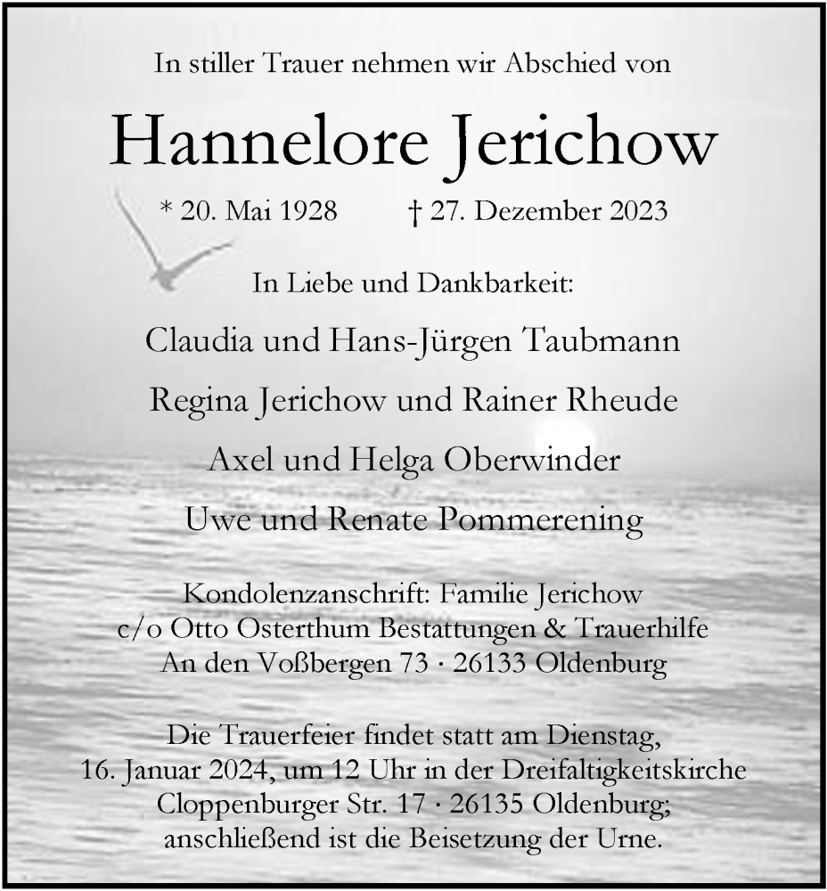 Hier finden Sie alle Traueranzeigen aus der Zeitung, die bisher für Hannelore Jerichow erschienen sind. Weitere Traueranzeigen, die in der Zeitung erscheinen, werden hier ebenfalls aufgelistet