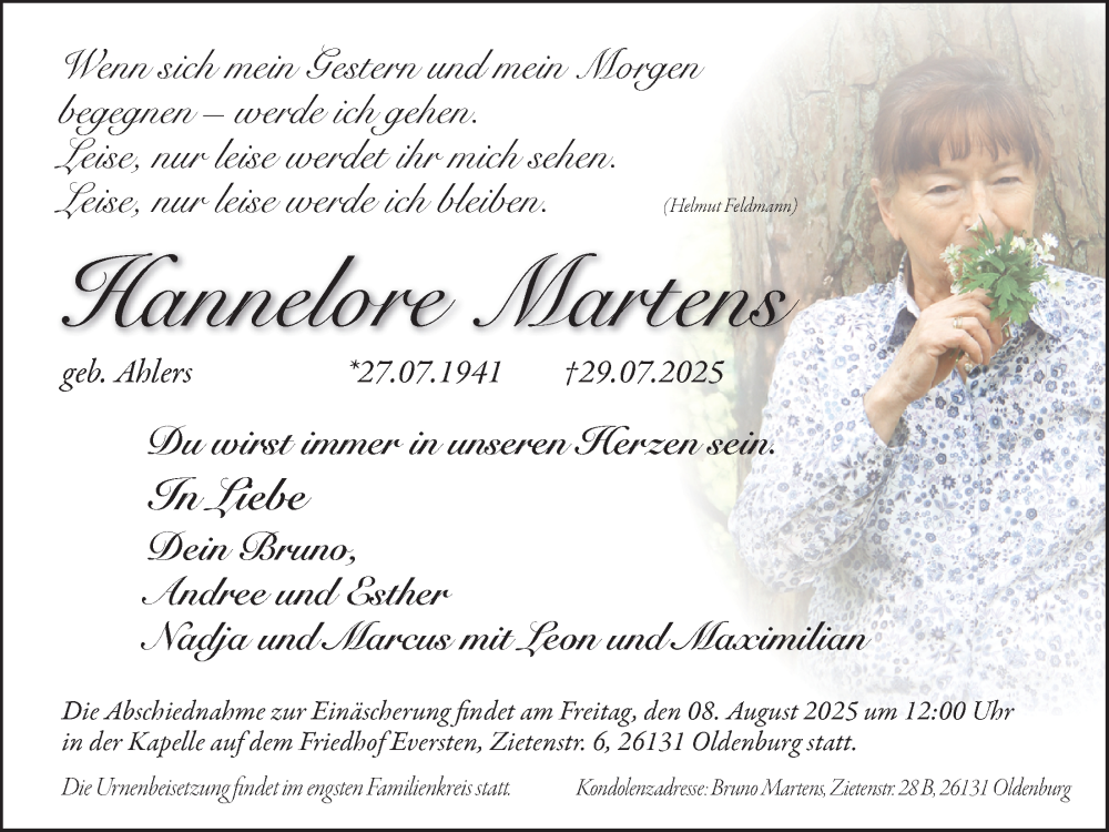 Hier finden Sie alle Traueranzeigen aus der Zeitung, die bisher für Hannelore Martens erschienen sind. Weitere Traueranzeigen, die in der Zeitung erscheinen, werden hier ebenfalls aufgelistet