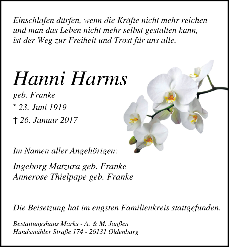 Hier finden Sie alle Traueranzeigen aus der Zeitung, die bisher für Hanni Harms erschienen sind. Weitere Traueranzeigen, die in der Zeitung erscheinen, werden hier ebenfalls aufgelistet