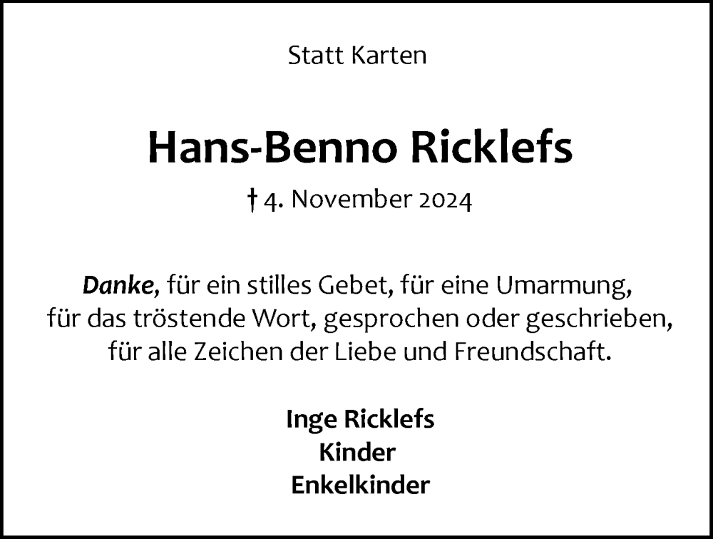 Hier finden Sie alle Traueranzeigen aus der Zeitung, die bisher für Hans-Benno Ricklefs erschienen sind. Weitere Traueranzeigen, die in der Zeitung erscheinen, werden hier ebenfalls aufgelistet