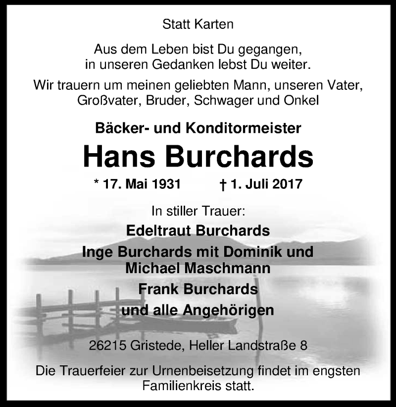 Hier finden Sie alle Traueranzeigen aus der Zeitung, die bisher für Hans Burchards erschienen sind. Weitere Traueranzeigen, die in der Zeitung erscheinen, werden hier ebenfalls aufgelistet