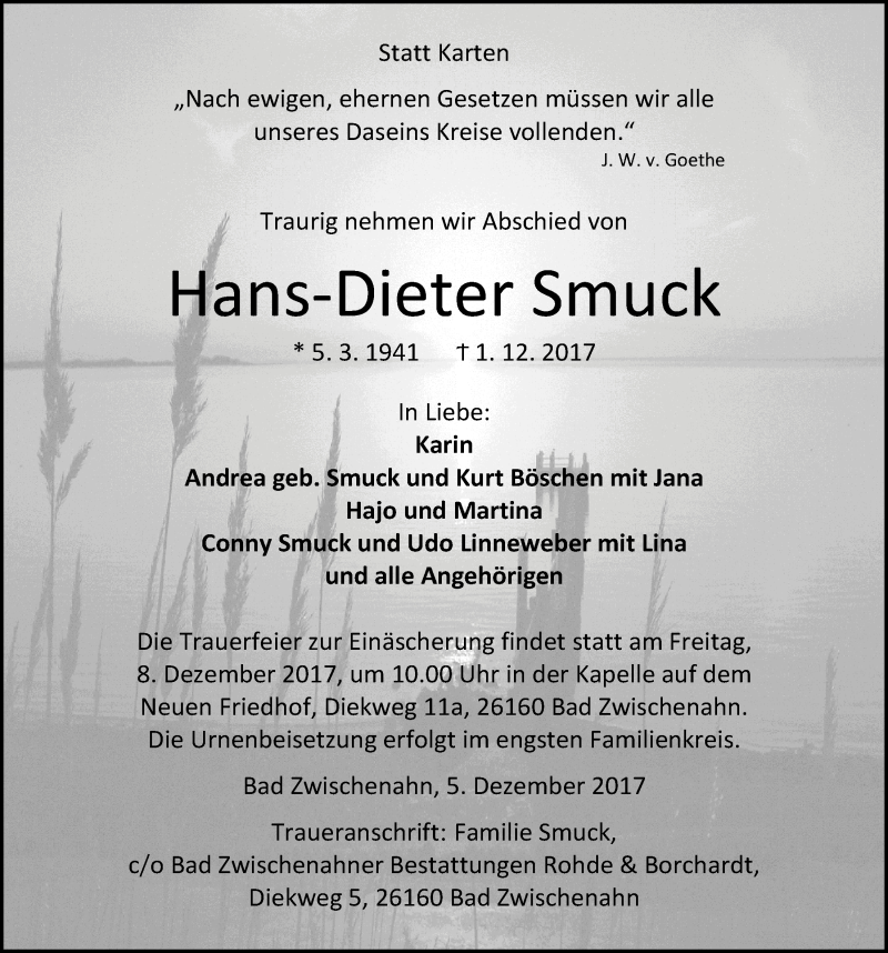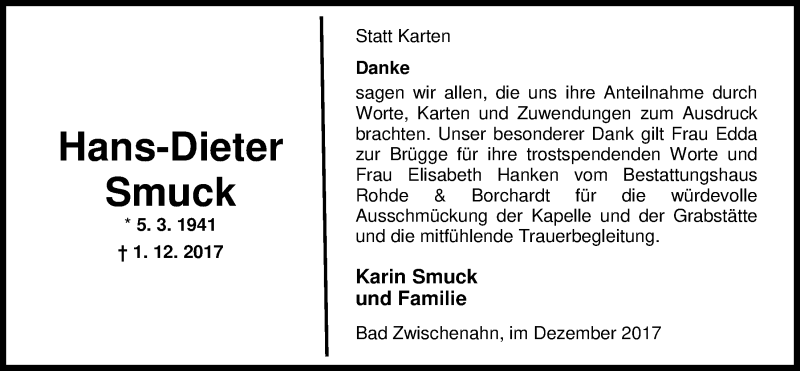 Hier finden Sie alle Traueranzeigen aus der Zeitung, die bisher für Hans-Dieter Smuck erschienen sind. Weitere Traueranzeigen, die in der Zeitung erscheinen, werden hier ebenfalls aufgelistet