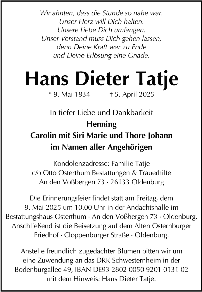 Hier finden Sie alle Traueranzeigen aus der Zeitung, die bisher für Hans Dieter Tatje erschienen sind. Weitere Traueranzeigen, die in der Zeitung erscheinen, werden hier ebenfalls aufgelistet