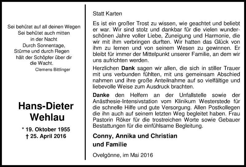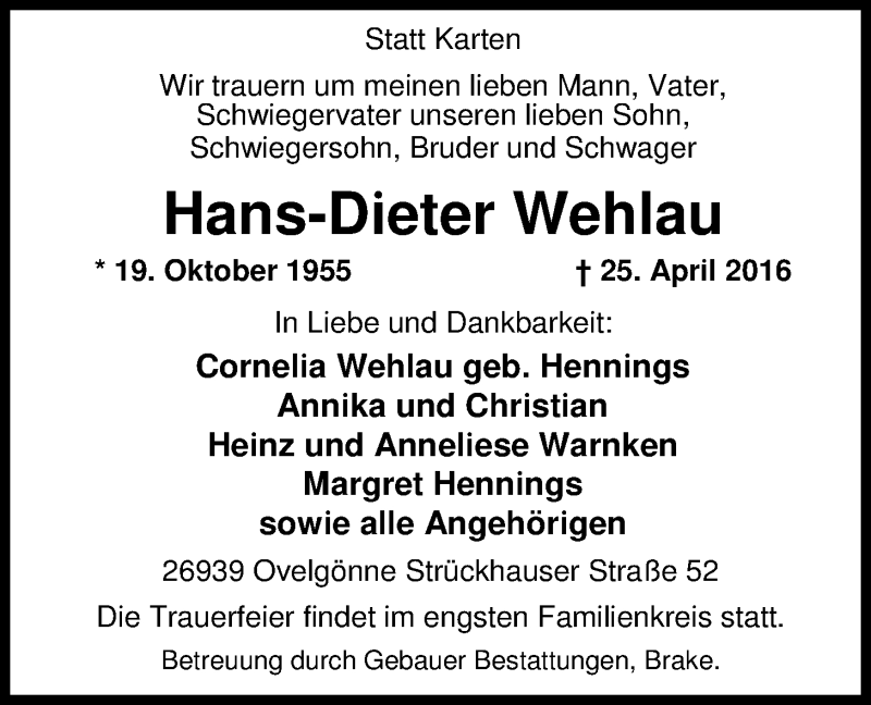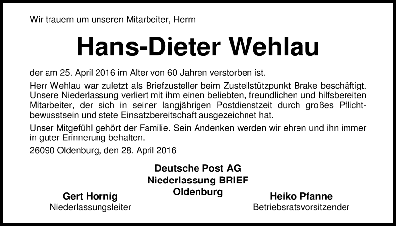 Hier finden Sie alle Traueranzeigen aus der Zeitung, die bisher für Hans-Dieter Wehlau erschienen sind. Weitere Traueranzeigen, die in der Zeitung erscheinen, werden hier ebenfalls aufgelistet