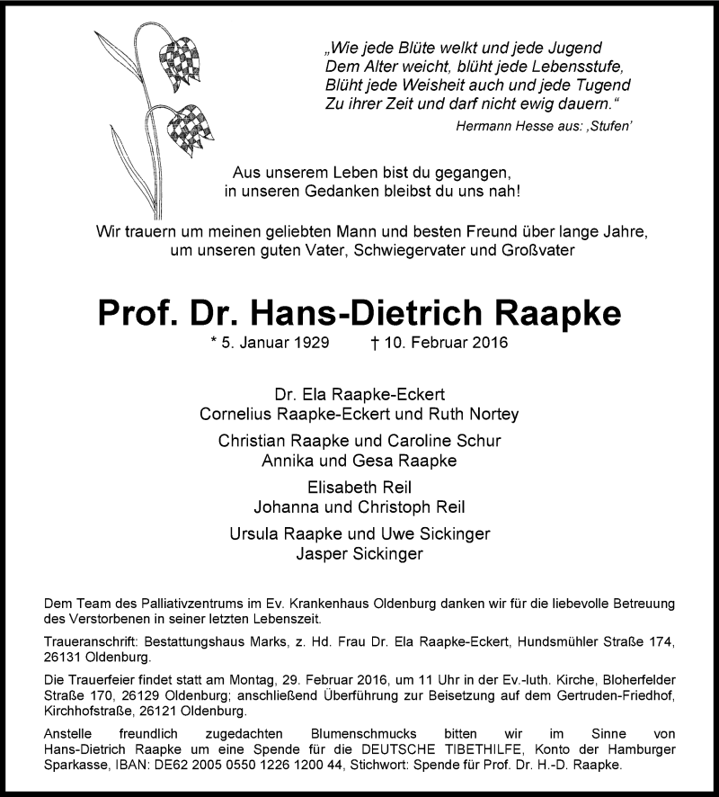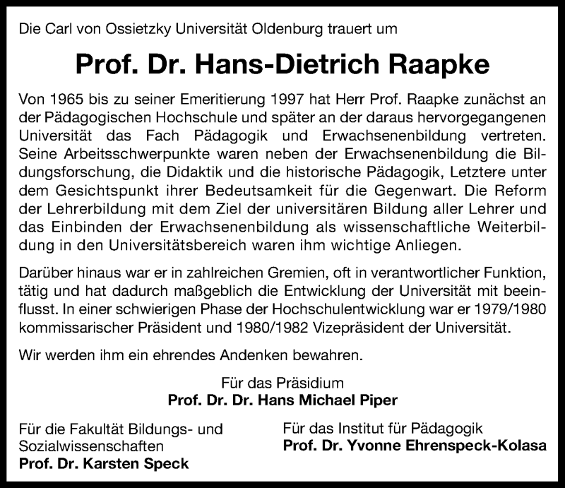 Hier finden Sie alle Traueranzeigen aus der Zeitung, die bisher für Hans-Dietrich Raapke erschienen sind. Weitere Traueranzeigen, die in der Zeitung erscheinen, werden hier ebenfalls aufgelistet