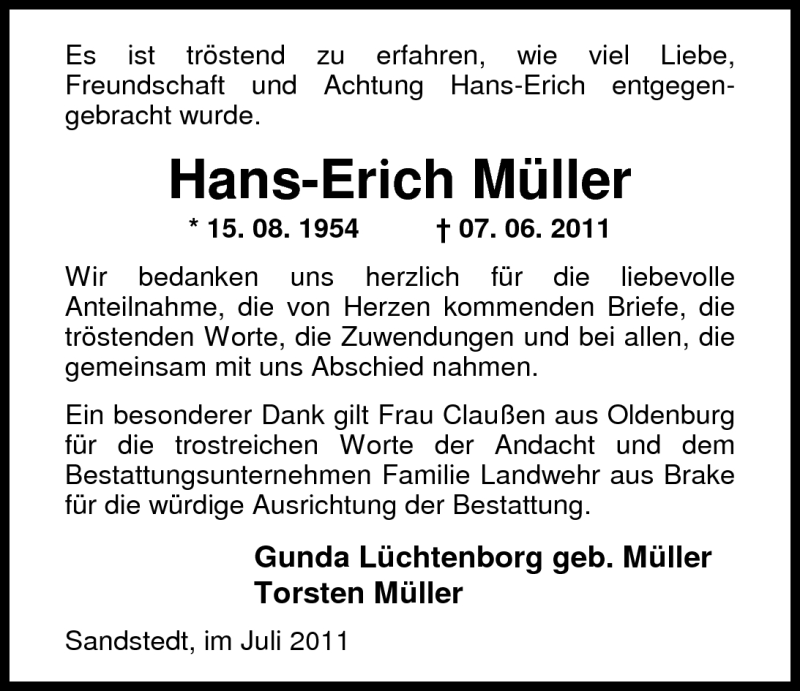 Hier finden Sie alle Traueranzeigen aus der Zeitung, die bisher für Hans-Erich Müller erschienen sind. Weitere Traueranzeigen, die in der Zeitung erscheinen, werden hier ebenfalls aufgelistet