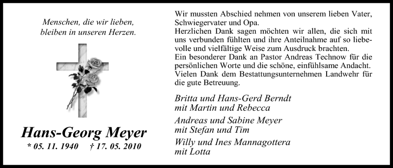 Hier finden Sie alle Traueranzeigen aus der Zeitung, die bisher für Hans-Georg Meyer erschienen sind. Weitere Traueranzeigen, die in der Zeitung erscheinen, werden hier ebenfalls aufgelistet