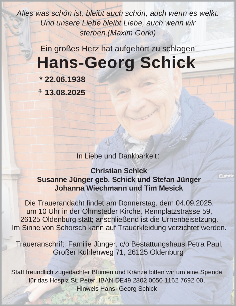 Hier finden Sie alle Traueranzeigen aus der Zeitung, die bisher für Hans-Georg Schick erschienen sind. Weitere Traueranzeigen, die in der Zeitung erscheinen, werden hier ebenfalls aufgelistet