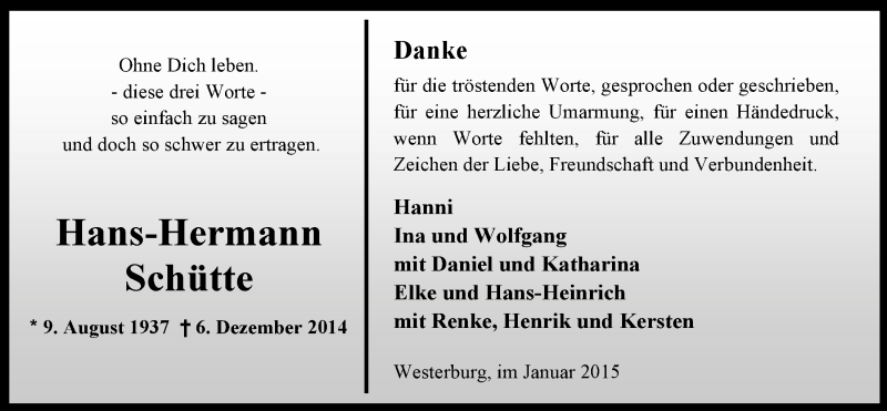 Hier finden Sie alle Traueranzeigen aus der Zeitung, die bisher für Hans-Hermann Schütte erschienen sind. Weitere Traueranzeigen, die in der Zeitung erscheinen, werden hier ebenfalls aufgelistet