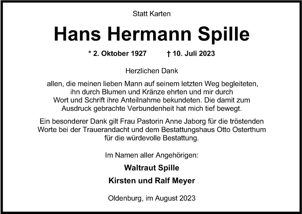 Hier finden Sie alle Traueranzeigen aus der Zeitung, die bisher für Hans Hermann Spille erschienen sind. Weitere Traueranzeigen, die in der Zeitung erscheinen, werden hier ebenfalls aufgelistet
