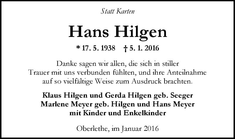 Hier finden Sie alle Traueranzeigen aus der Zeitung, die bisher für Hans Hilgen erschienen sind. Weitere Traueranzeigen, die in der Zeitung erscheinen, werden hier ebenfalls aufgelistet