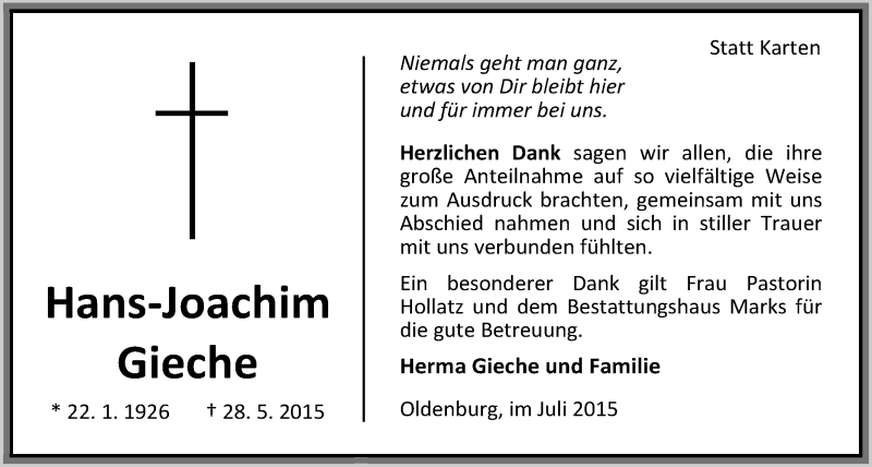 Hier finden Sie alle Traueranzeigen aus der Zeitung, die bisher für Hans-Joachim Gieche erschienen sind. Weitere Traueranzeigen, die in der Zeitung erscheinen, werden hier ebenfalls aufgelistet