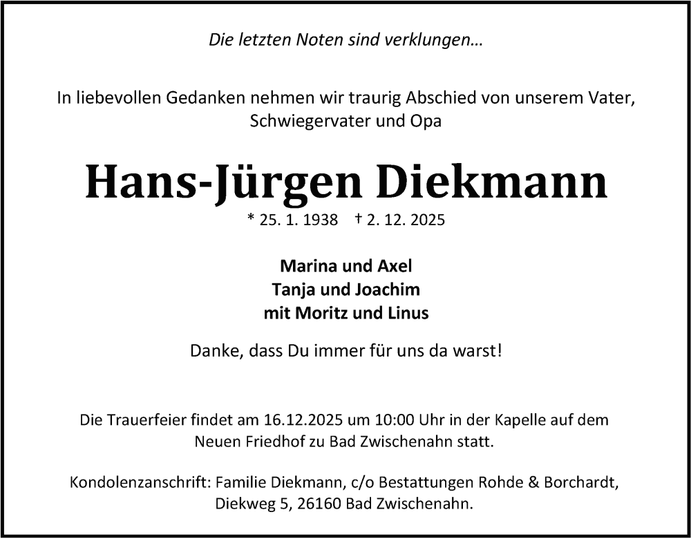 Hier finden Sie alle Traueranzeigen aus der Zeitung, die bisher für Hans-Jürgen Diekmann erschienen sind. Weitere Traueranzeigen, die in der Zeitung erscheinen, werden hier ebenfalls aufgelistet