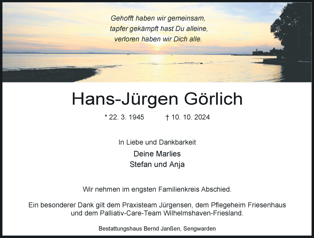 Hier finden Sie alle Traueranzeigen aus der Zeitung, die bisher für Hans-Jürgen Görlich erschienen sind. Weitere Traueranzeigen, die in der Zeitung erscheinen, werden hier ebenfalls aufgelistet