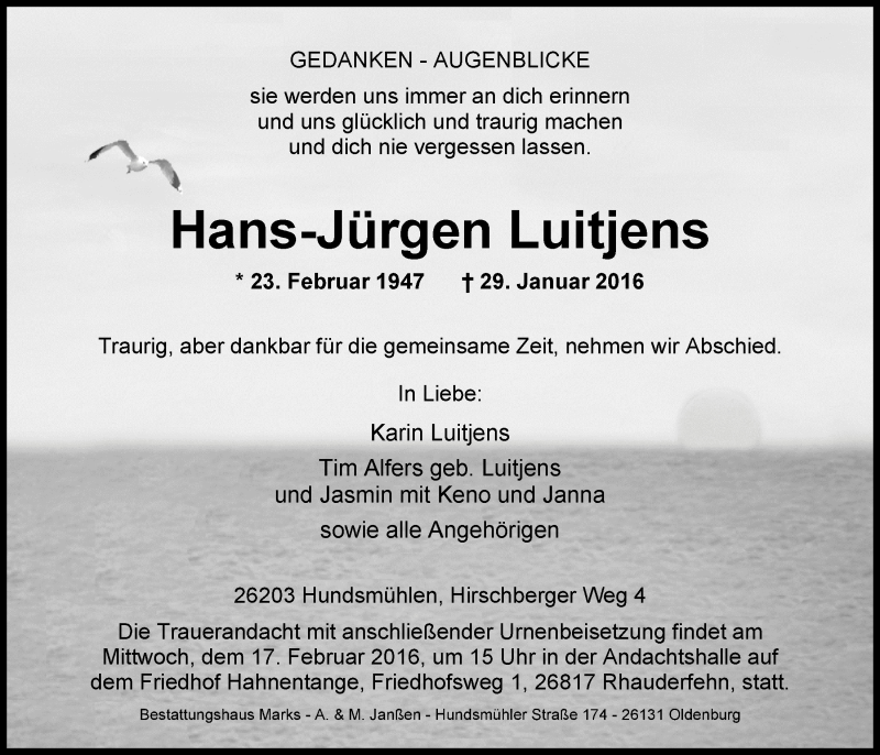 Hier finden Sie alle Traueranzeigen aus der Zeitung, die bisher für Hans-Jürgen Luitjens erschienen sind. Weitere Traueranzeigen, die in der Zeitung erscheinen, werden hier ebenfalls aufgelistet