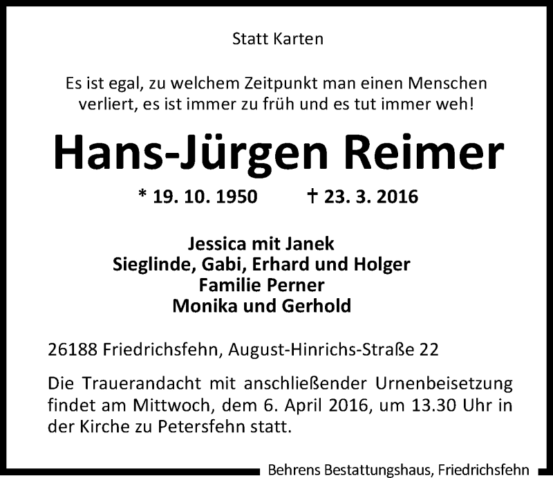 Hier finden Sie alle Traueranzeigen aus der Zeitung, die bisher für Hans-Jürgen Reimer erschienen sind. Weitere Traueranzeigen, die in der Zeitung erscheinen, werden hier ebenfalls aufgelistet