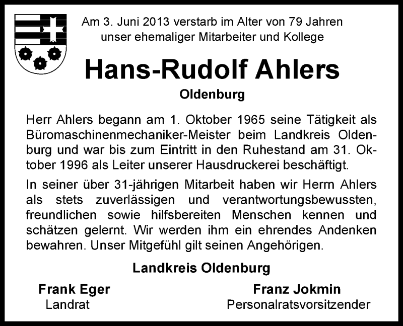 Hier finden Sie alle Traueranzeigen aus der Zeitung, die bisher für Hans-Rudolf Ahlers erschienen sind. Weitere Traueranzeigen, die in der Zeitung erscheinen, werden hier ebenfalls aufgelistet