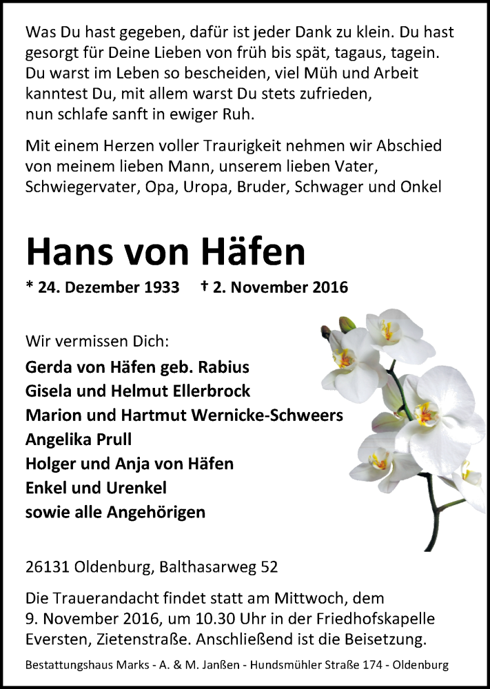 Hier finden Sie alle Traueranzeigen aus der Zeitung, die bisher für Hans von Häfen erschienen sind. Weitere Traueranzeigen, die in der Zeitung erscheinen, werden hier ebenfalls aufgelistet