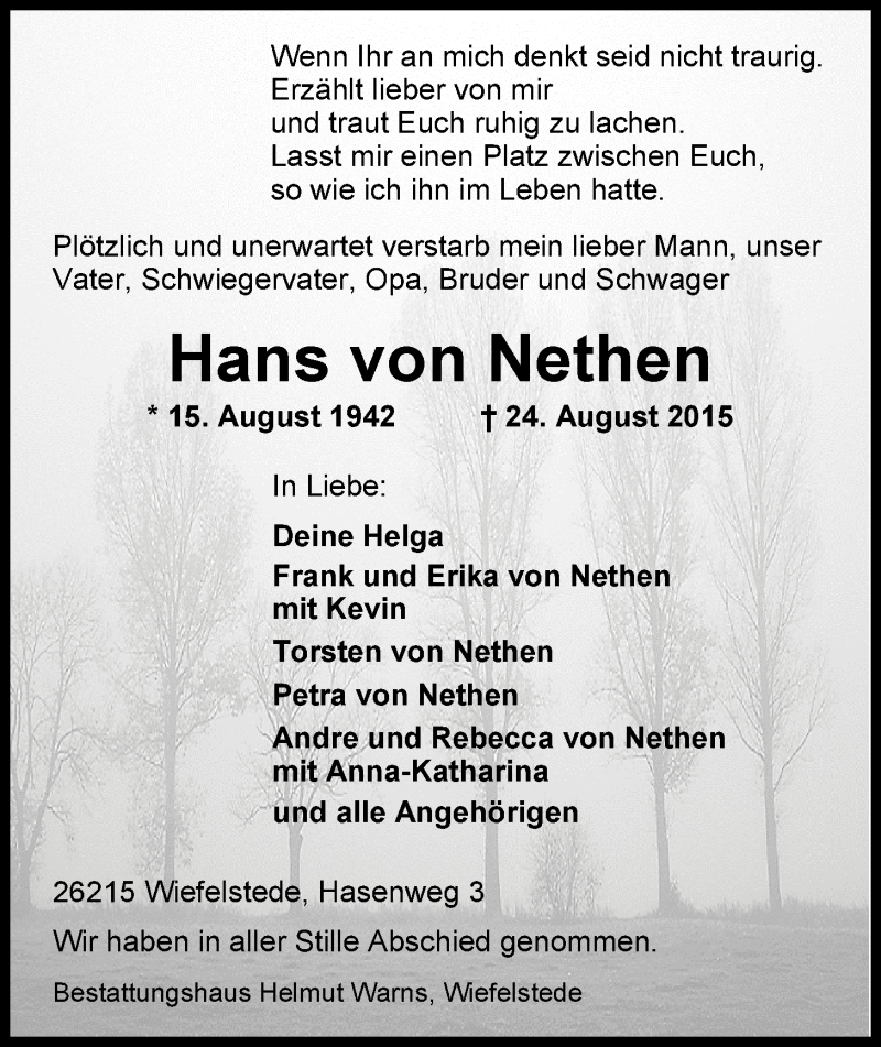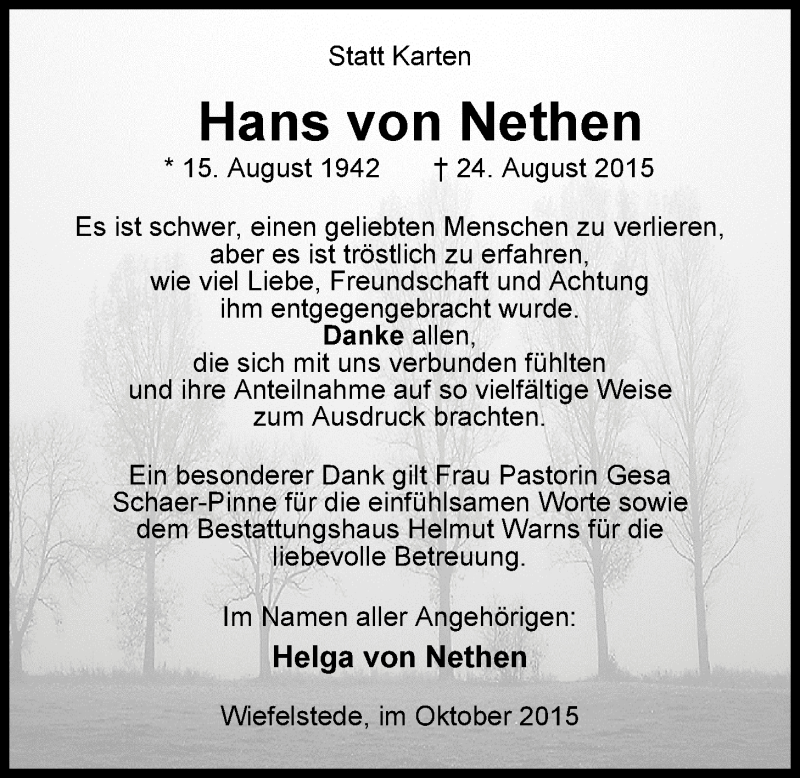 Hier finden Sie alle Traueranzeigen aus der Zeitung, die bisher für Hans von Nethen erschienen sind. Weitere Traueranzeigen, die in der Zeitung erscheinen, werden hier ebenfalls aufgelistet
