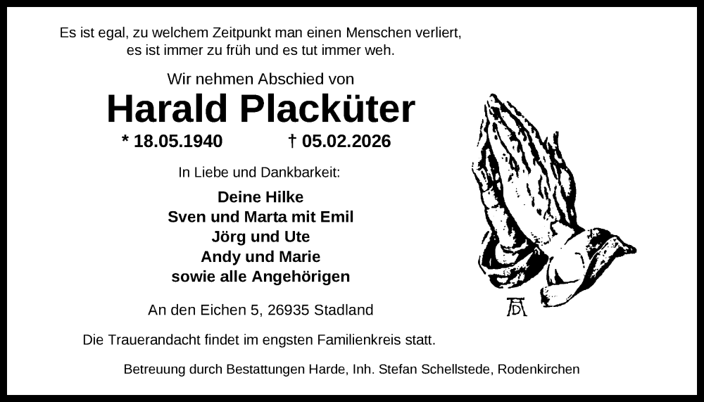 Hier finden Sie alle Traueranzeigen aus der Zeitung, die bisher für Harald Placküter erschienen sind. Weitere Traueranzeigen, die in der Zeitung erscheinen, werden hier ebenfalls aufgelistet