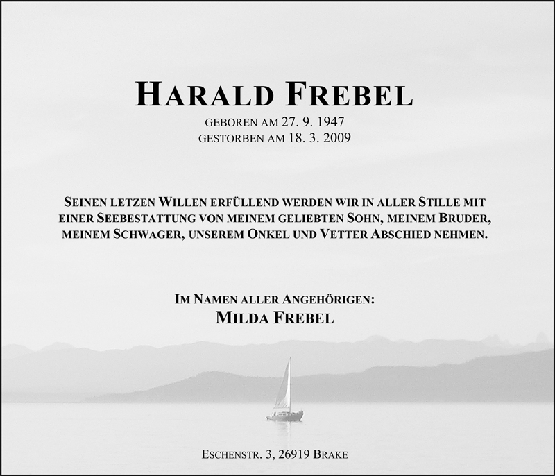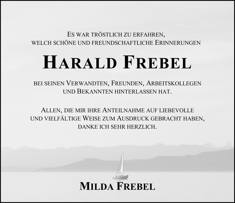 Hier finden Sie alle Traueranzeigen aus der Zeitung, die bisher für Harald Frebel erschienen sind. Weitere Traueranzeigen, die in der Zeitung erscheinen, werden hier ebenfalls aufgelistet