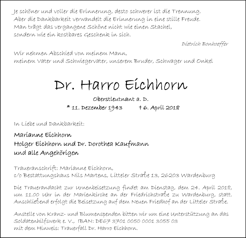 Hier finden Sie alle Traueranzeigen aus der Zeitung, die bisher für Harro Eichhorn erschienen sind. Weitere Traueranzeigen, die in der Zeitung erscheinen, werden hier ebenfalls aufgelistet