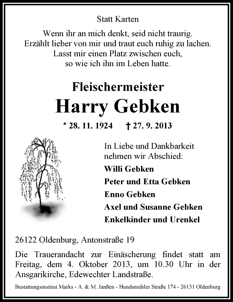 Hier finden Sie alle Traueranzeigen aus der Zeitung, die bisher für Harry Gebken erschienen sind. Weitere Traueranzeigen, die in der Zeitung erscheinen, werden hier ebenfalls aufgelistet
