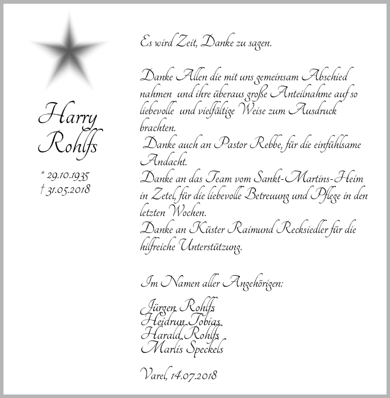 Hier finden Sie alle Traueranzeigen aus der Zeitung, die bisher für Harry Rohlfs erschienen sind. Weitere Traueranzeigen, die in der Zeitung erscheinen, werden hier ebenfalls aufgelistet