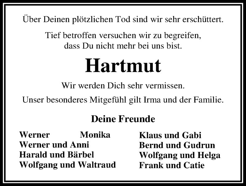Hier finden Sie alle Traueranzeigen aus der Zeitung, die bisher für Hartmut Ripken erschienen sind. Weitere Traueranzeigen, die in der Zeitung erscheinen, werden hier ebenfalls aufgelistet