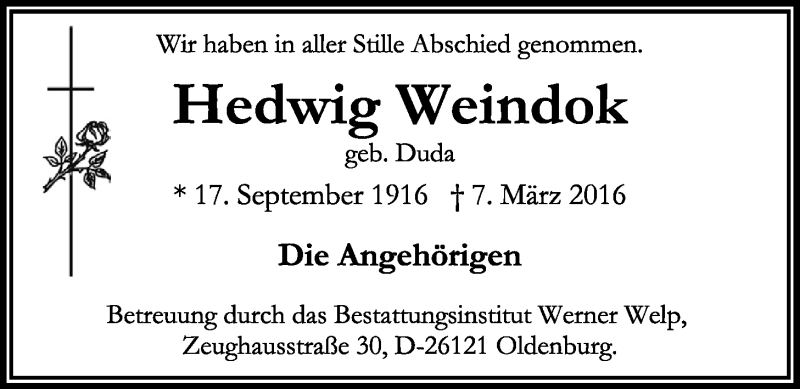 Hier finden Sie alle Traueranzeigen aus der Zeitung, die bisher für Hedwig Weindok erschienen sind. Weitere Traueranzeigen, die in der Zeitung erscheinen, werden hier ebenfalls aufgelistet