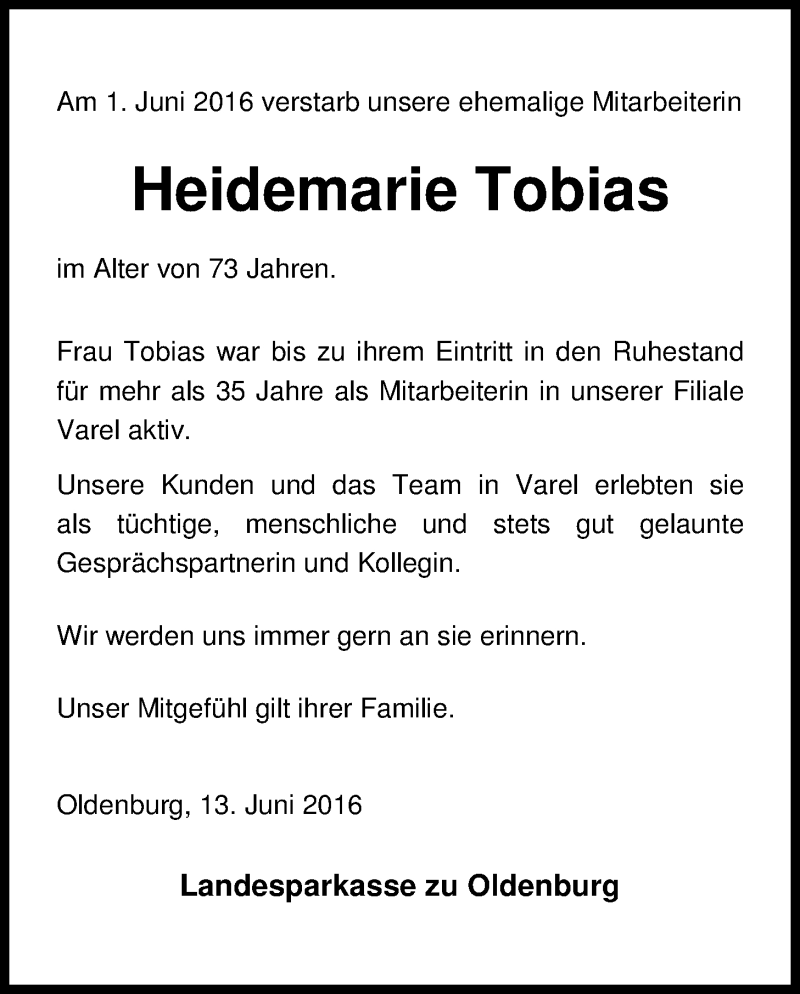 Hier finden Sie alle Traueranzeigen aus der Zeitung, die bisher für Heidemarie Tobias erschienen sind. Weitere Traueranzeigen, die in der Zeitung erscheinen, werden hier ebenfalls aufgelistet
