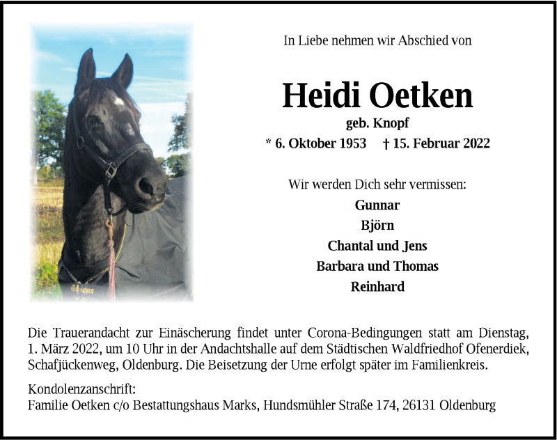 Hier finden Sie alle Traueranzeigen aus der Zeitung, die bisher für Heidi Oetken erschienen sind. Weitere Traueranzeigen, die in der Zeitung erscheinen, werden hier ebenfalls aufgelistet