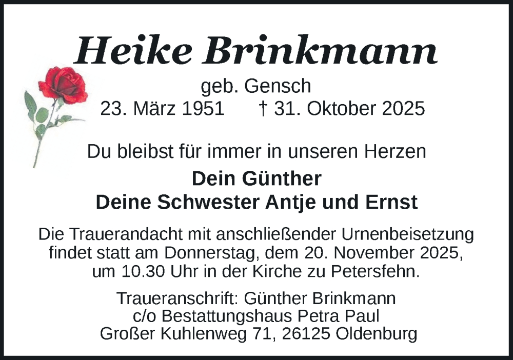 Hier finden Sie alle Traueranzeigen aus der Zeitung, die bisher für Heike Brinkmann erschienen sind. Weitere Traueranzeigen, die in der Zeitung erscheinen, werden hier ebenfalls aufgelistet