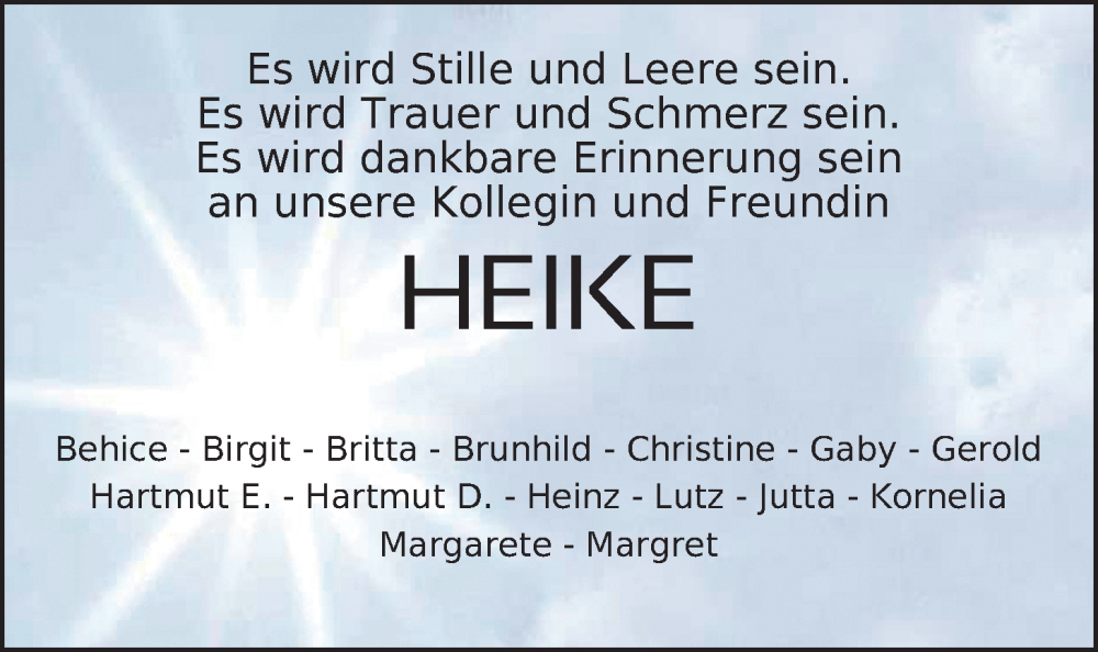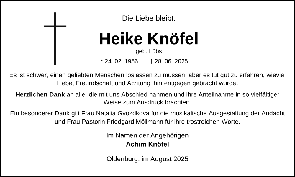 Hier finden Sie alle Traueranzeigen aus der Zeitung, die bisher für Heike Knöfel erschienen sind. Weitere Traueranzeigen, die in der Zeitung erscheinen, werden hier ebenfalls aufgelistet