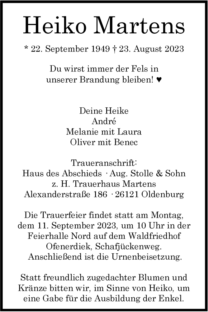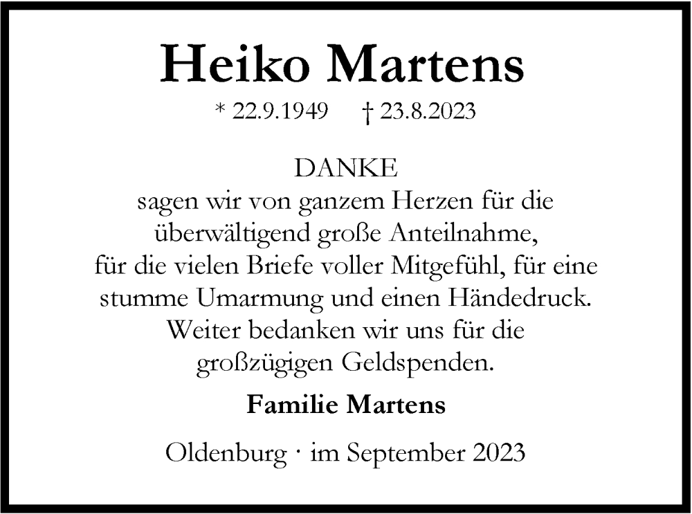 Hier finden Sie alle Traueranzeigen aus der Zeitung, die bisher für Heiko Martens erschienen sind. Weitere Traueranzeigen, die in der Zeitung erscheinen, werden hier ebenfalls aufgelistet