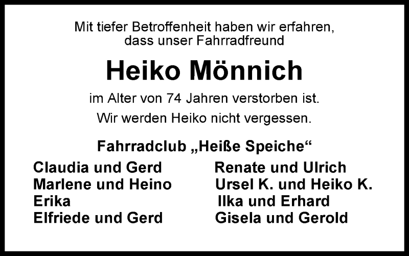 Hier finden Sie alle Traueranzeigen aus der Zeitung, die bisher für Heiko Mönnich erschienen sind. Weitere Traueranzeigen, die in der Zeitung erscheinen, werden hier ebenfalls aufgelistet