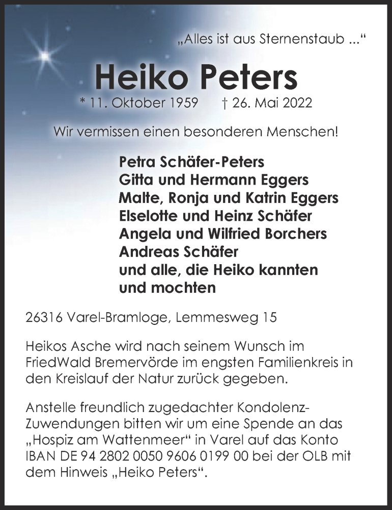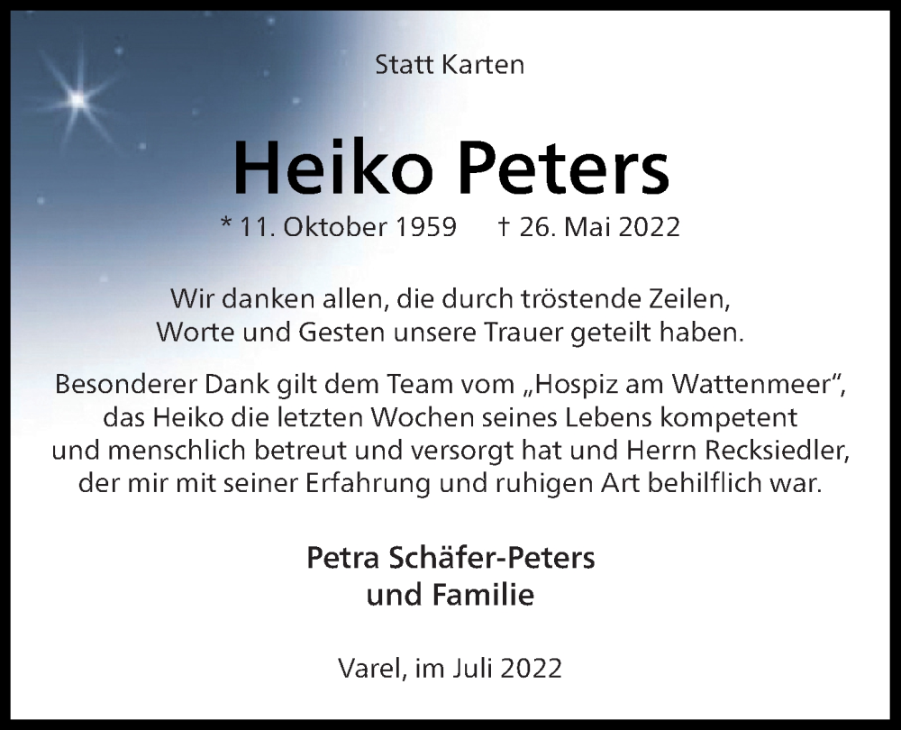 Hier finden Sie alle Traueranzeigen aus der Zeitung, die bisher für Heiko Peters erschienen sind. Weitere Traueranzeigen, die in der Zeitung erscheinen, werden hier ebenfalls aufgelistet