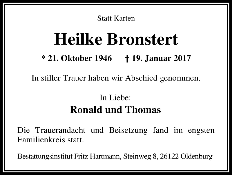Hier finden Sie alle Traueranzeigen aus der Zeitung, die bisher für Heilke Bronstert erschienen sind. Weitere Traueranzeigen, die in der Zeitung erscheinen, werden hier ebenfalls aufgelistet