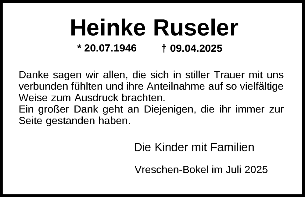 Hier finden Sie alle Traueranzeigen aus der Zeitung, die bisher für Heinke Ruseler erschienen sind. Weitere Traueranzeigen, die in der Zeitung erscheinen, werden hier ebenfalls aufgelistet