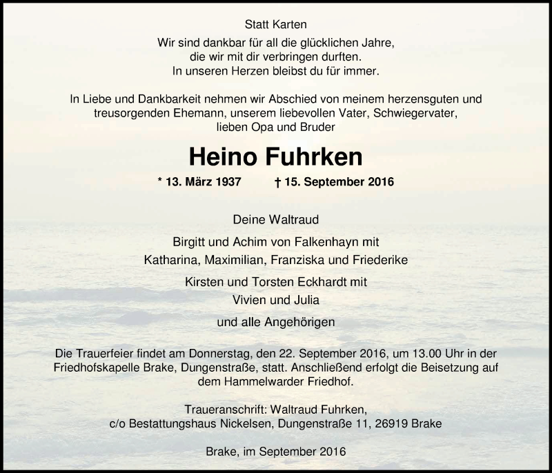 Hier finden Sie alle Traueranzeigen aus der Zeitung, die bisher für Heino Fuhrken erschienen sind. Weitere Traueranzeigen, die in der Zeitung erscheinen, werden hier ebenfalls aufgelistet