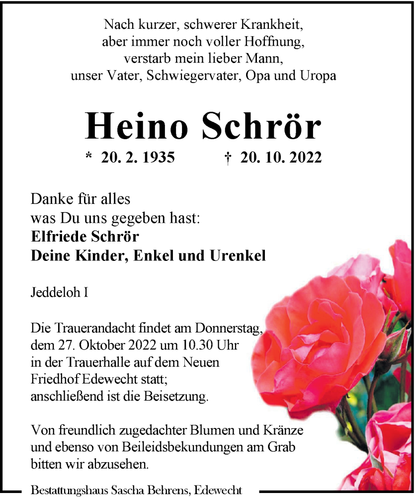 Hier finden Sie alle Traueranzeigen aus der Zeitung, die bisher für Heino Schrör erschienen sind. Weitere Traueranzeigen, die in der Zeitung erscheinen, werden hier ebenfalls aufgelistet