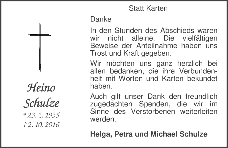 Hier finden Sie alle Traueranzeigen aus der Zeitung, die bisher für Heino Schulze erschienen sind. Weitere Traueranzeigen, die in der Zeitung erscheinen, werden hier ebenfalls aufgelistet