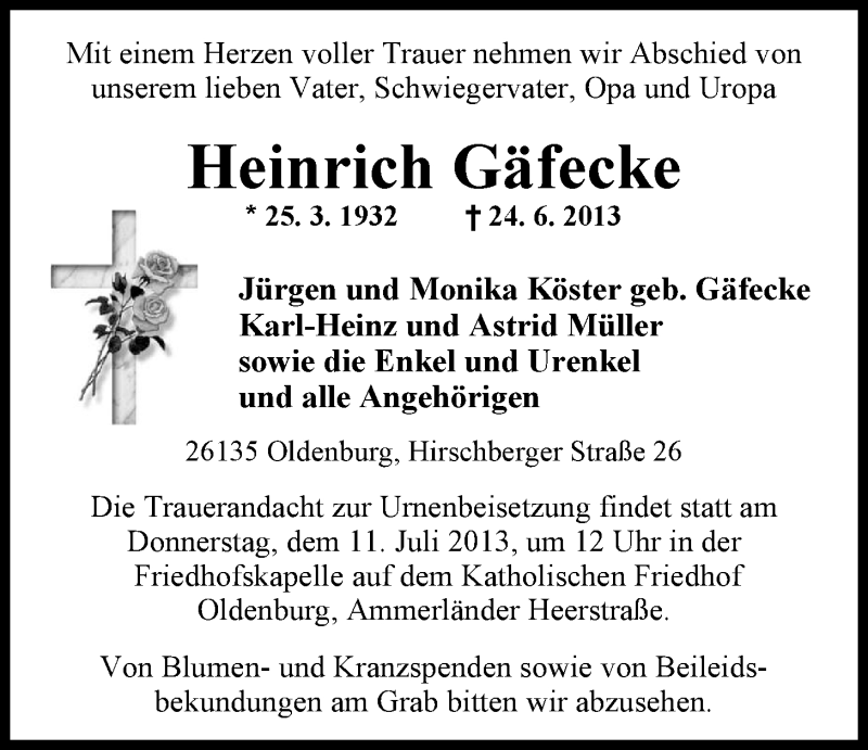 Hier finden Sie alle Traueranzeigen aus der Zeitung, die bisher für Heinrich Gäfecke erschienen sind. Weitere Traueranzeigen, die in der Zeitung erscheinen, werden hier ebenfalls aufgelistet