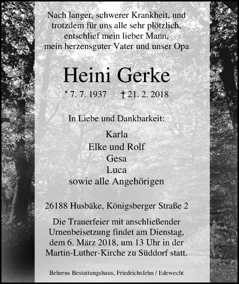 Hier finden Sie alle Traueranzeigen aus der Zeitung, die bisher für Heinrich Gerke erschienen sind. Weitere Traueranzeigen, die in der Zeitung erscheinen, werden hier ebenfalls aufgelistet
