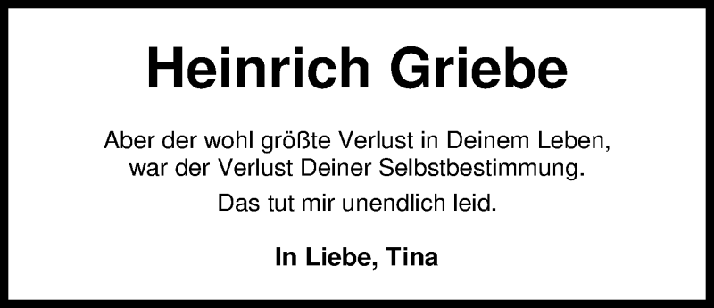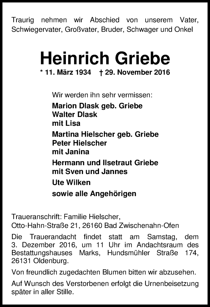 Hier finden Sie alle Traueranzeigen aus der Zeitung, die bisher für Heinrich Griebe erschienen sind. Weitere Traueranzeigen, die in der Zeitung erscheinen, werden hier ebenfalls aufgelistet