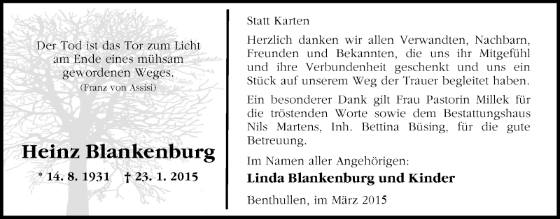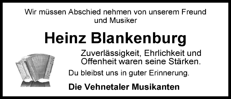 Hier finden Sie alle Traueranzeigen aus der Zeitung, die bisher für Heinz Blankenburg erschienen sind. Weitere Traueranzeigen, die in der Zeitung erscheinen, werden hier ebenfalls aufgelistet