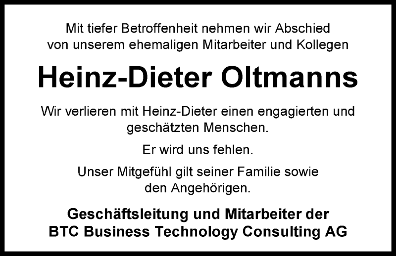 Hier finden Sie alle Traueranzeigen aus der Zeitung, die bisher für Heinz-Dieter Oltmanns erschienen sind. Weitere Traueranzeigen, die in der Zeitung erscheinen, werden hier ebenfalls aufgelistet