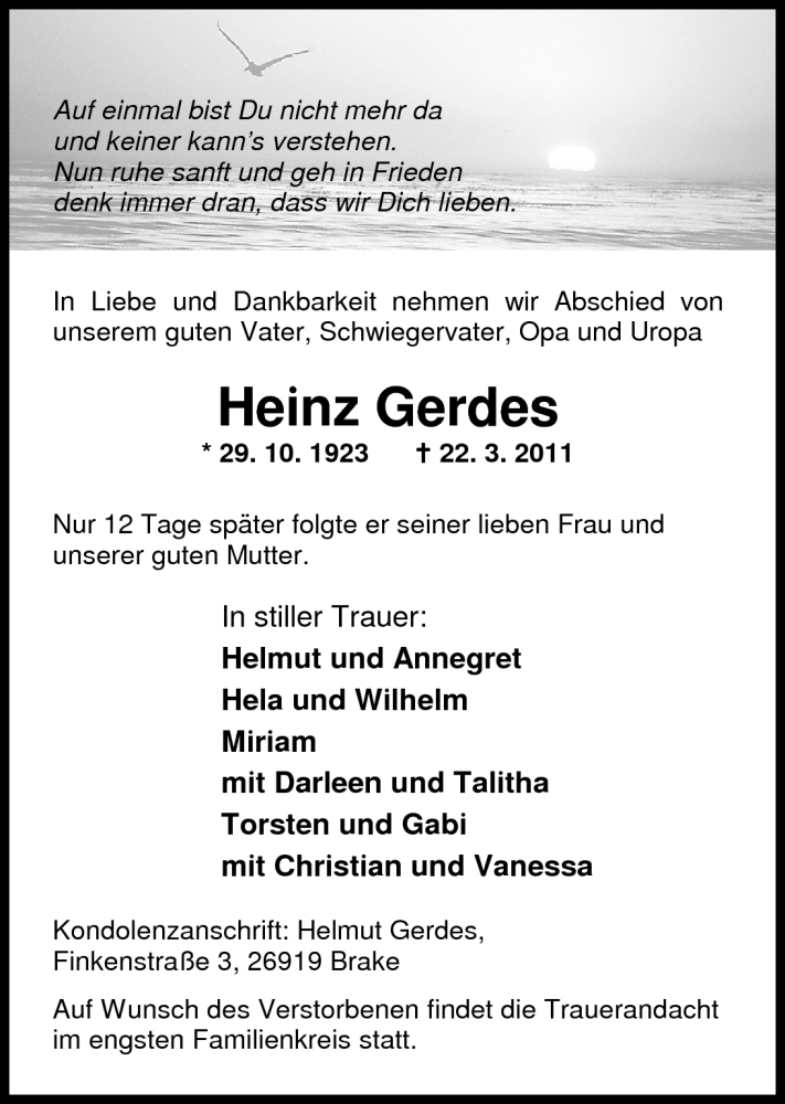 Hier finden Sie alle Traueranzeigen aus der Zeitung, die bisher für Heinz Gerdes erschienen sind. Weitere Traueranzeigen, die in der Zeitung erscheinen, werden hier ebenfalls aufgelistet